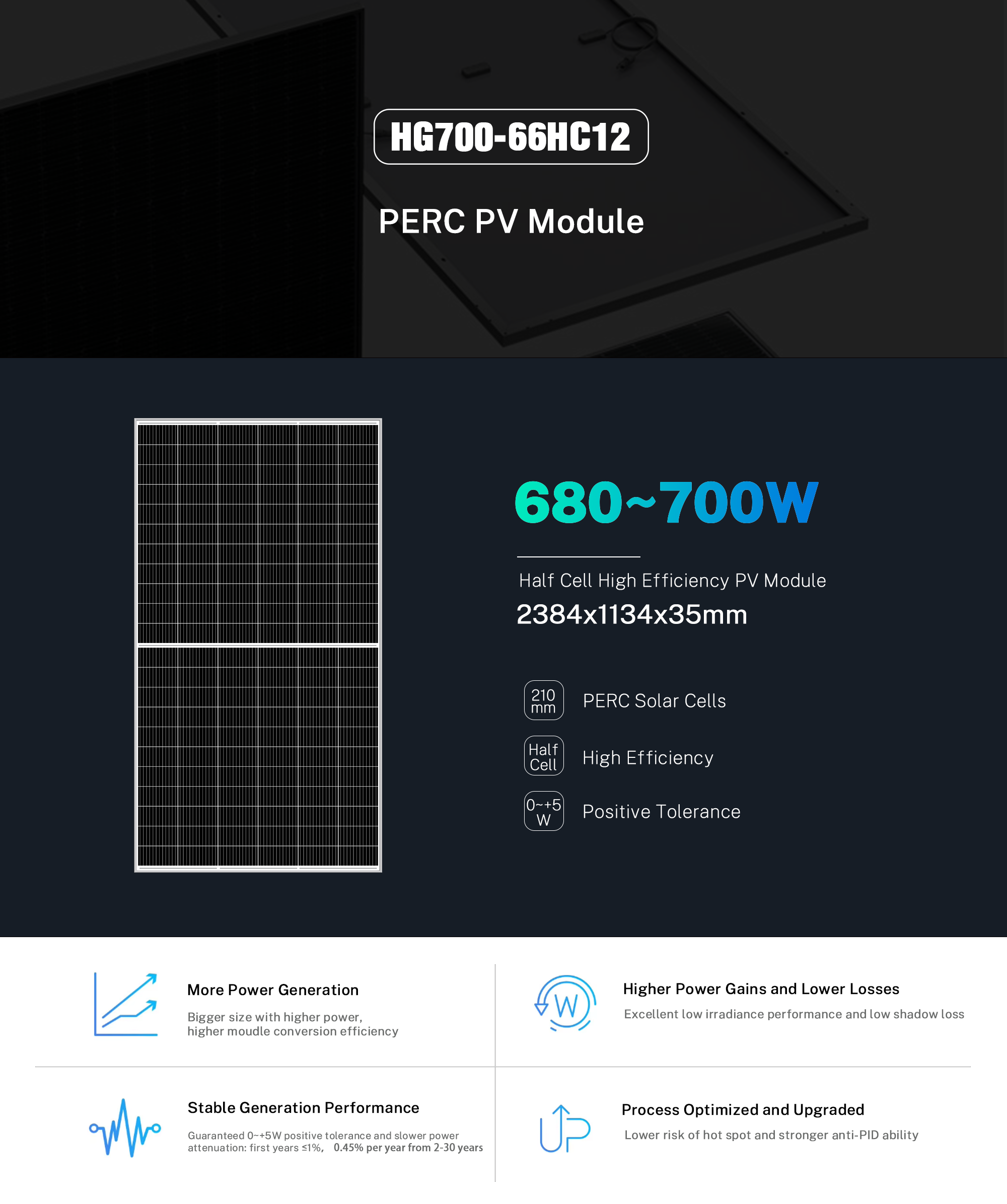 为了实现最具成本效益的产品,海光科技推出新一代超高效率组件——210系列。该系列采用210mm硅片,结合PERC、多栅线电池技术和高密度封装,组件效率高达25.5%,正式迈入700W+时代。